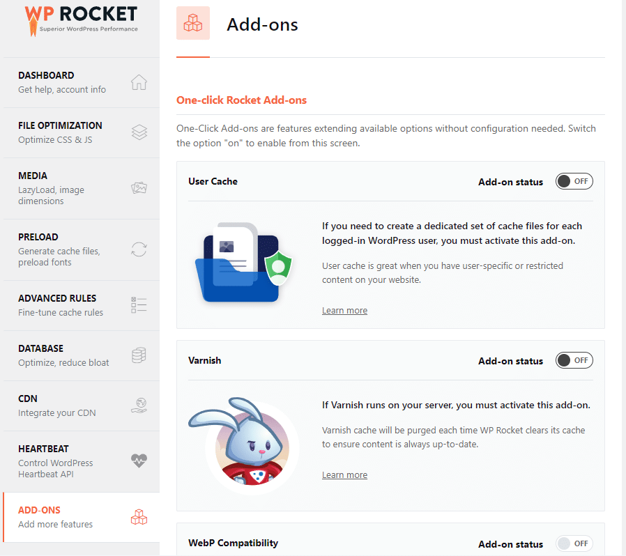 Add-ons extend functionality: Varnish cache support for server-level optimization, Cloudflare integration for purging and analytics, and Sucuri for security-enhanced caching. These are toggled with one click, making advanced setups accessible.