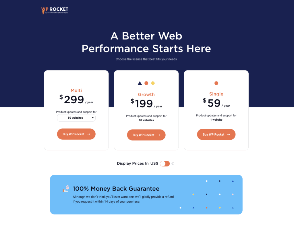 WP Rocket is comes with premium plan only and doesn’t come with no trail and free version. Plans are only in annual, no mothly plans available. They have three tier plans, you can buy according to your business needs and use. Here are the plans: